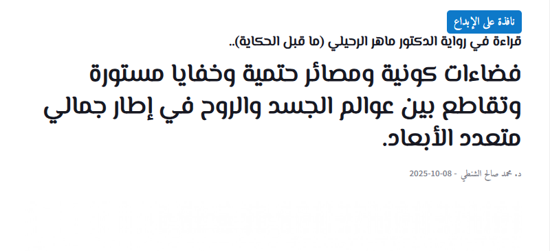 الرئيسية/ما كتب عني/قراءة في رواية ماهر الرحيلي “ما قبل الحكاية”للأستاذ الدكتور محمد الشنطي. غير مصنف قراءة في رواية ماهر الرحيلي “ما قبل الحكاية”للأستاذ الدكتور محمد الشنطي. ماهر الرحيلي1 يناير، 2026آخر تحديث: 1 يناير، 20260 738 أقل من دقيقة فضاءات كونية ومصائر حتمية وخفايا مستورة وتقاطع بين عوالم الجسد والروح في إطار جمالي متعدد الأبعاد. ماهر الرحيلي1 يناير، 2026آخر تحديث: 1 يناير، 20260 738 أقل من دقيقة اظهر المزيد مشاركة المحتوى فيسبوك تويتر واتساب تيلقرام مشاركة عبر البريد طباعة